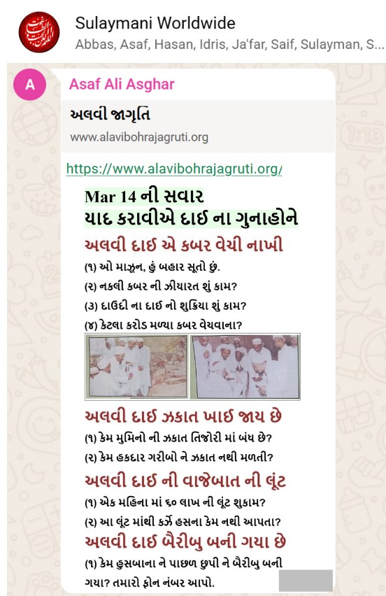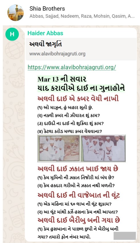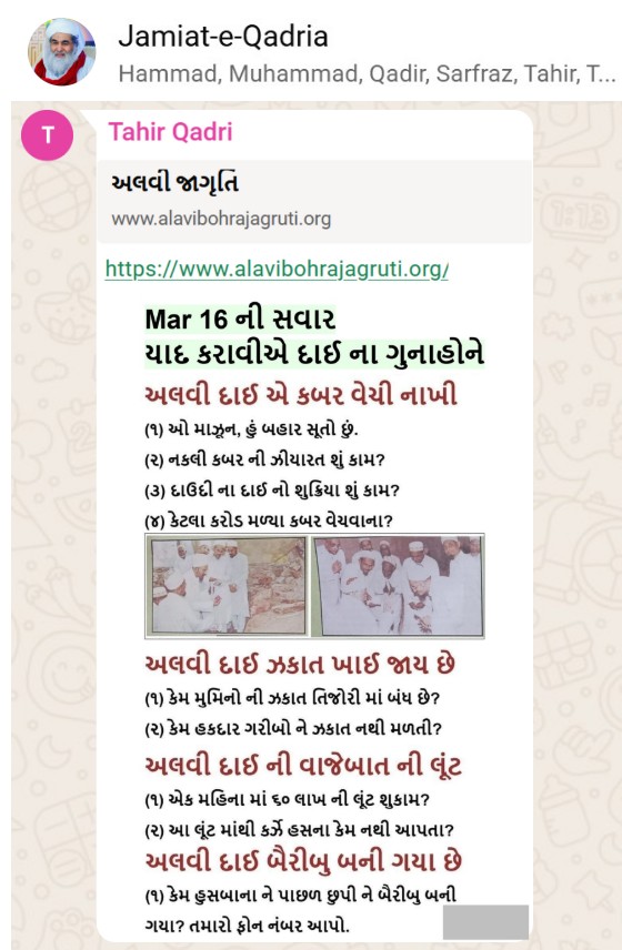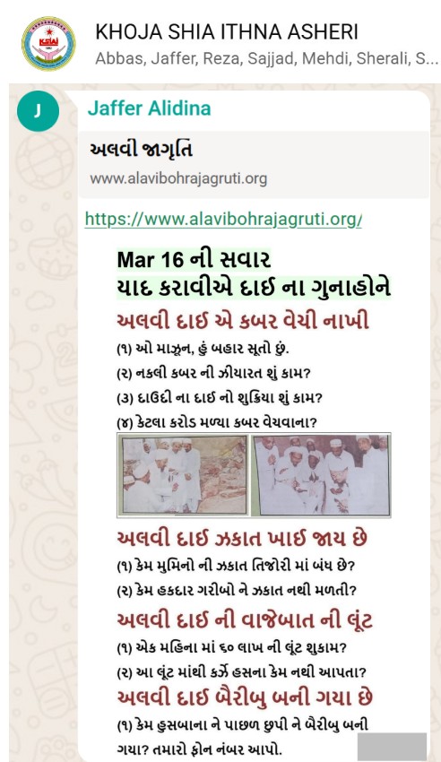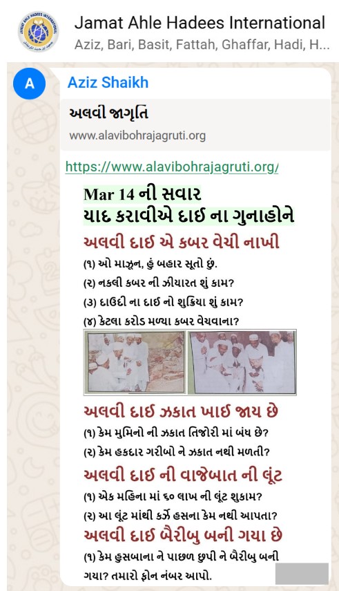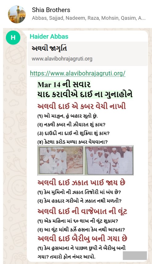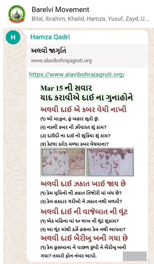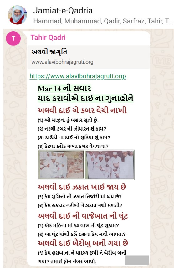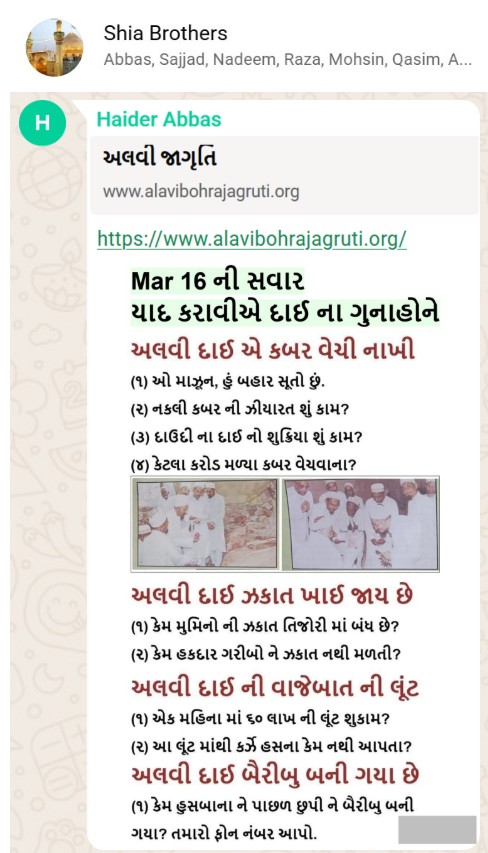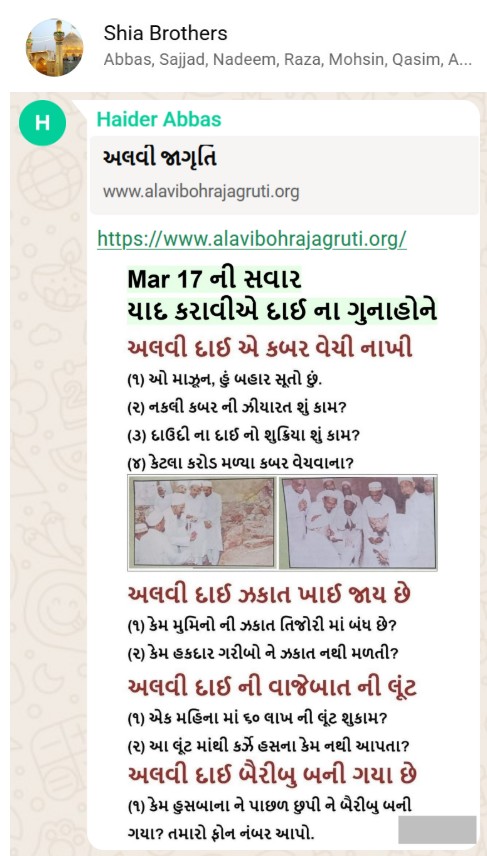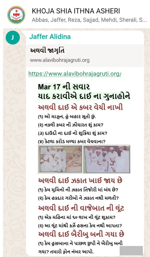 | 5 | | 4 - ભાઈ, અમે જે બીજી જમાત ના લોકો ને આમંત્રણ આપીયે છે એ મુસલમાન છે. અમે જે દાવત ના બુરા કામો અને ગુનાહો ને એમની જમાત માં ફેલાવા માંગીયે છે એ જમાત મુસલમાન હોવી જોઈએ તો જ એ લોકો સમજી શકે. આ વાણિયા ભાઈ કે સ્વામિનારાયણ ભાઈ ને શું સમજ પડે ઝકાત નું શું મહત્વ, દાઈ નું ફરઝ, દાઈ જમાત પર ઝુલ્મ અને લૂંટ ના કરી શકે, વિગેરે. આ ખાલી મુસલમાન જમાત જ સમજી શકે. તો આ વાણિયા ભાઈ કે સ્વામિનારાયણ ભાઈ અપને શું કામ લાગે? જો તમે સમજાવી શકો કે એ કામ લાગી શકે તો અમે એમને પણ screenshot મોકલીશું. - હુસેની |