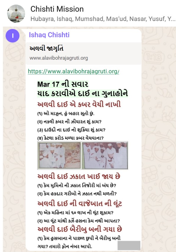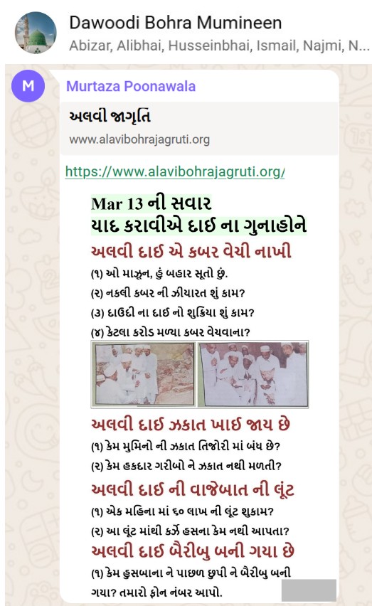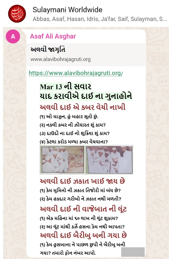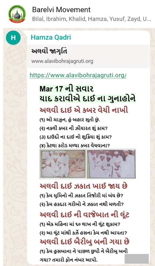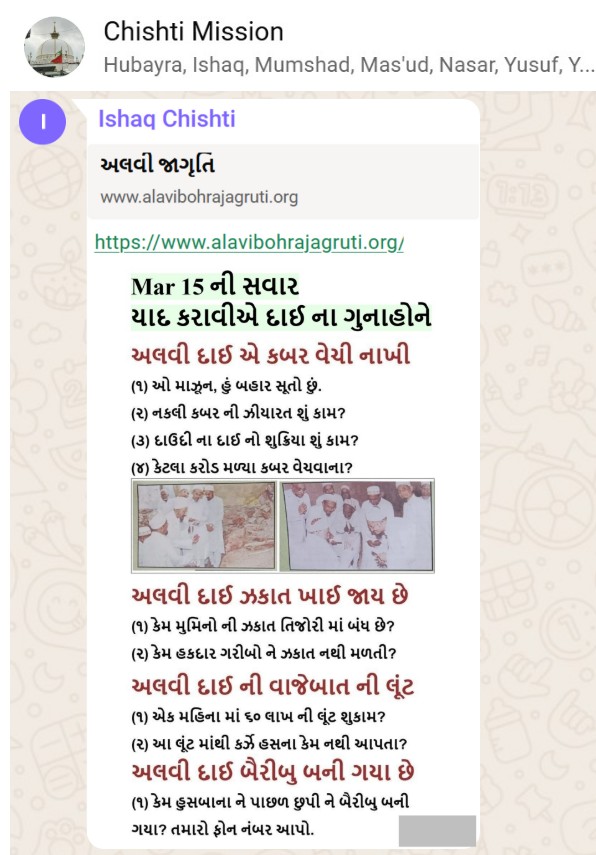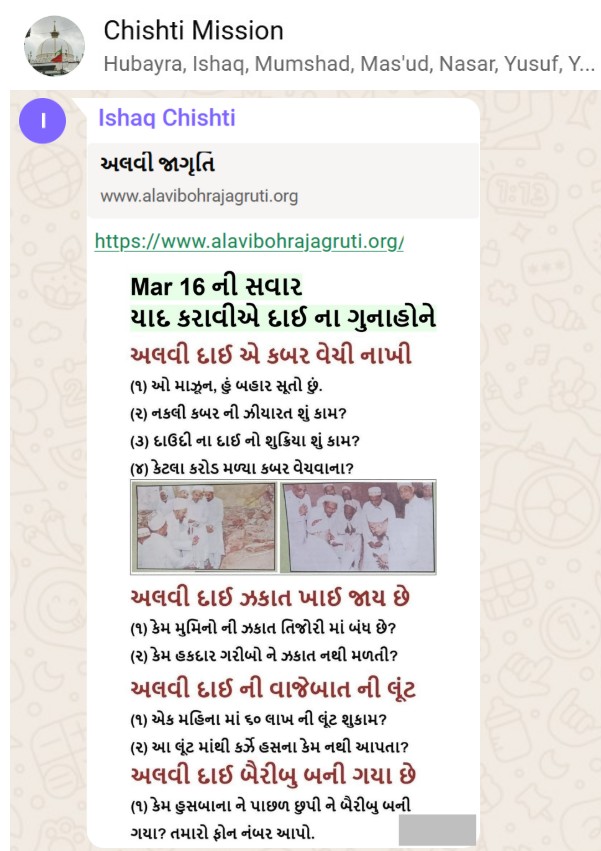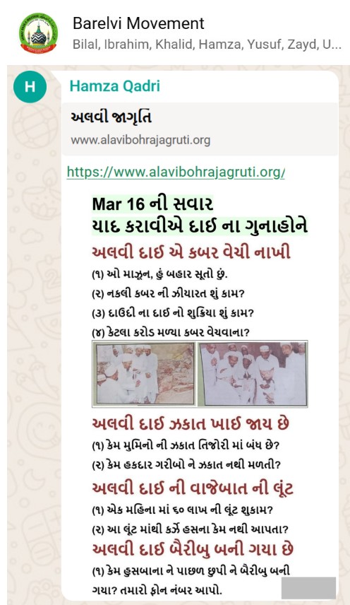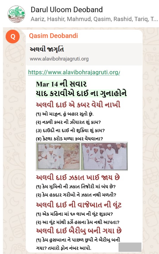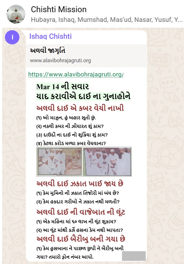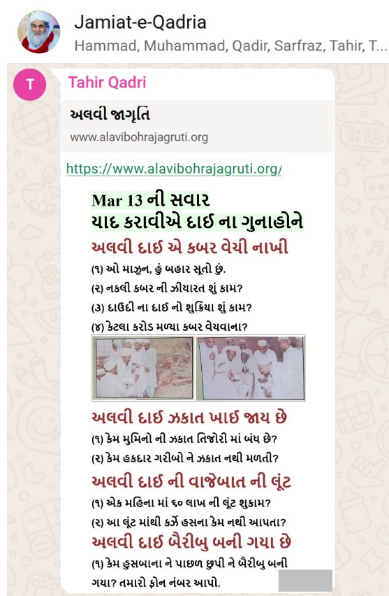 | 5 | | 4 - ભાઈ, અમે જે બીજી જમાત ના લોકો ને આમંત્રણ આપીયે છે એ મુસલમાન છે. અમે જે દાવત ના બુરા કામો અને ગુનાહો ને એમની જમાત માં ફેલાવા માંગીયે છે એ જમાત મુસલમાન હોવી જોઈએ તો જ એ લોકો સમજી શકે. આ વાણિયા ભાઈ કે સ્વામિનારાયણ ભાઈ ને શું સમજ પડે ઝકાત નું શું મહત્વ, દાઈ નું ફરઝ, દાઈ જમાત પર ઝુલ્મ અને લૂંટ ના કરી શકે, વિગેરે. આ ખાલી મુસલમાન જમાત જ સમજી શકે. તો આ વાણિયા ભાઈ કે સ્વામિનારાયણ ભાઈ અપને શું કામ લાગે? જો તમે સમજાવી શકો કે એ કામ લાગી શકે તો અમે એમને પણ screenshot મોકલીશું. - હુસેની |