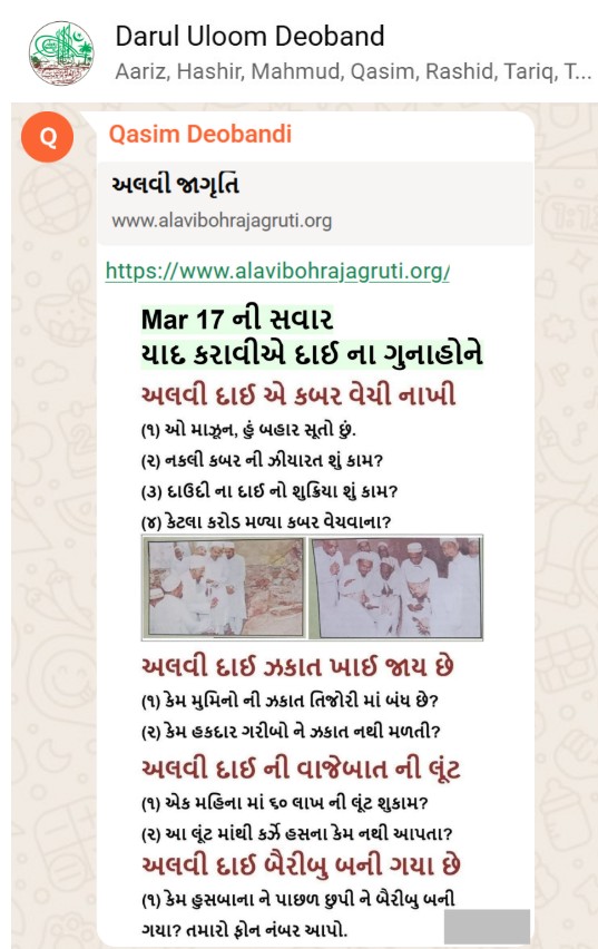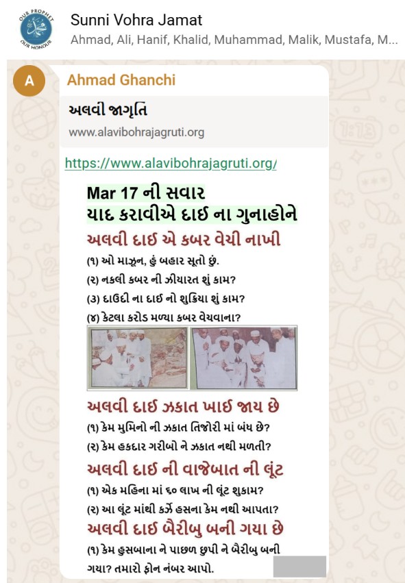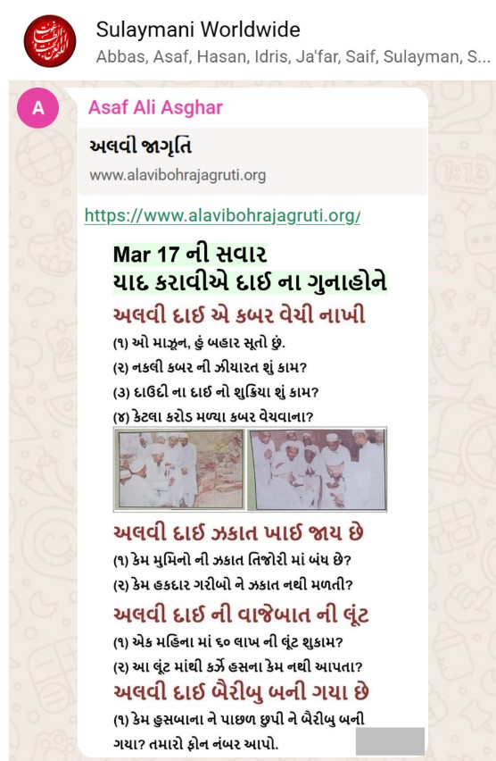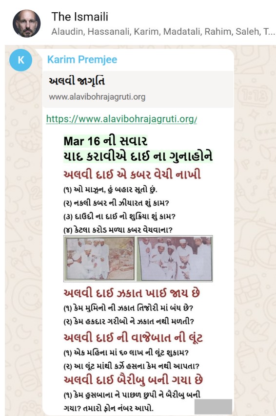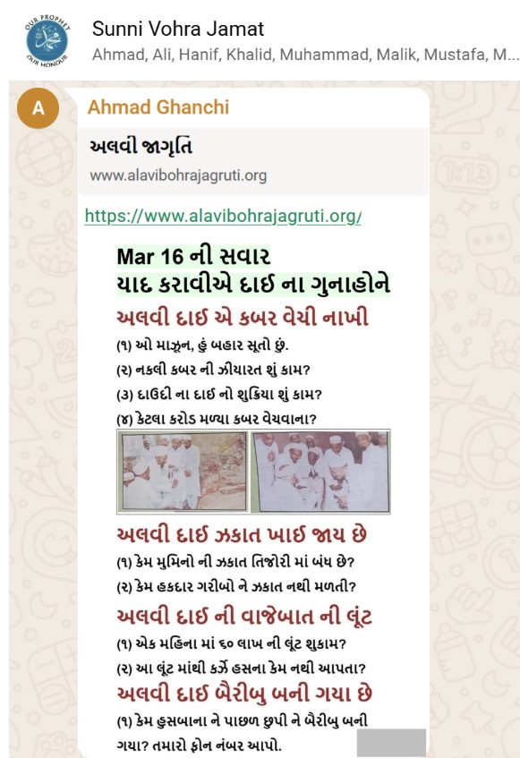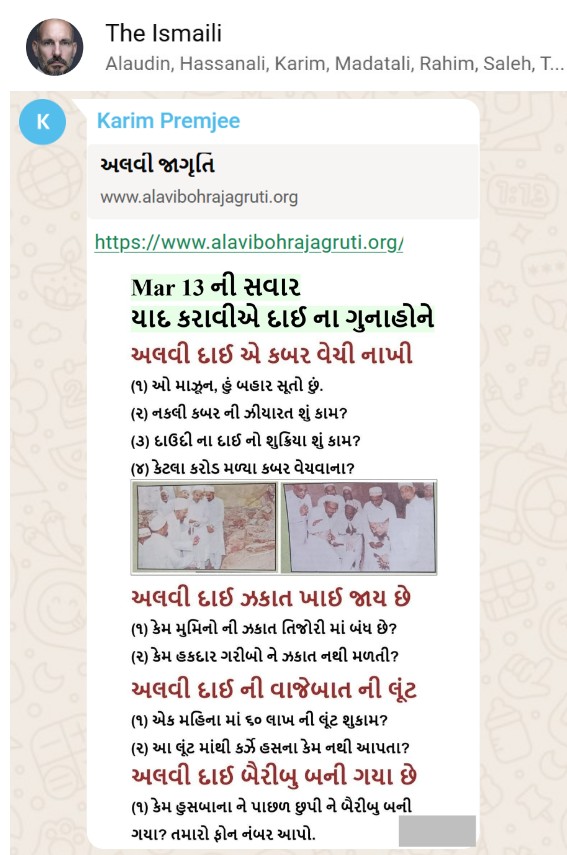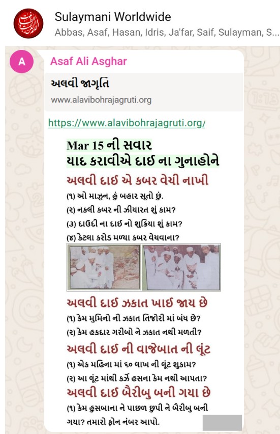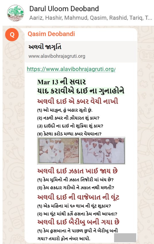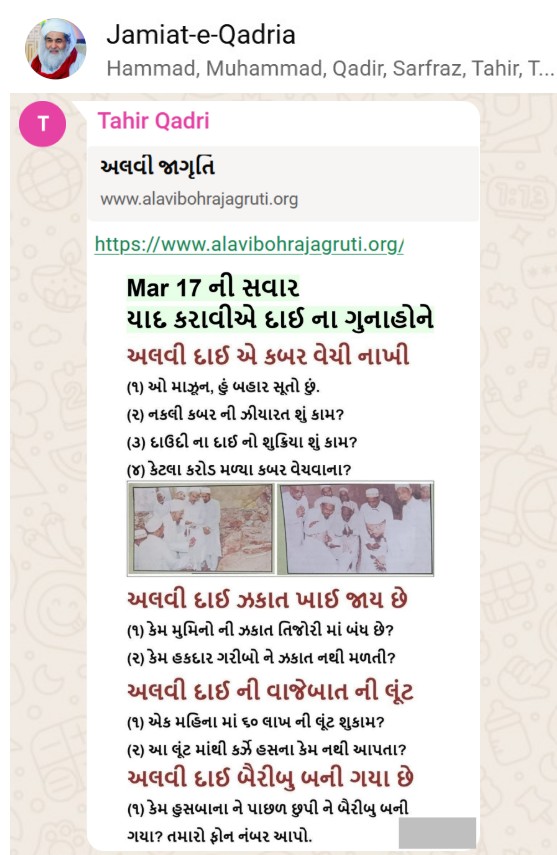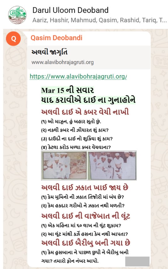 | 5 | | 4 - ભાઈ, અમે જે બીજી જમાત ના લોકો ને આમંત્રણ આપીયે છે એ મુસલમાન છે. અમે જે દાવત ના બુરા કામો અને ગુનાહો ને એમની જમાત માં ફેલાવા માંગીયે છે એ જમાત મુસલમાન હોવી જોઈએ તો જ એ લોકો સમજી શકે. આ વાણિયા ભાઈ કે સ્વામિનારાયણ ભાઈ ને શું સમજ પડે ઝકાત નું શું મહત્વ, દાઈ નું ફરઝ, દાઈ જમાત પર ઝુલ્મ અને લૂંટ ના કરી શકે, વિગેરે. આ ખાલી મુસલમાન જમાત જ સમજી શકે. તો આ વાણિયા ભાઈ કે સ્વામિનારાયણ ભાઈ અપને શું કામ લાગે? જો તમે સમજાવી શકો કે એ કામ લાગી શકે તો અમે એમને પણ screenshot મોકલીશું. - હુસેની |